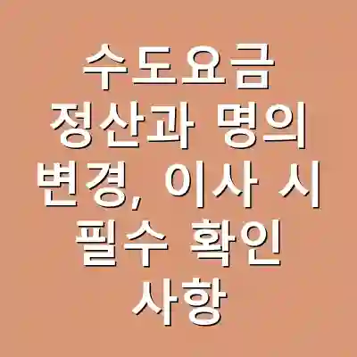 이사 시 수도요금 정산과 명의 변경은 필수적입니다. 정확한 정산을 통해 불필요한 요금 부담을 피할 수 있으며, 신속한 명의 변경으로 요금 청구의 정확성을 유지할 수 있습니다. 필요한 절차를 미리 준비하고 체크리스트를 활용하여 이사를 성공적으로 마무리하세요.